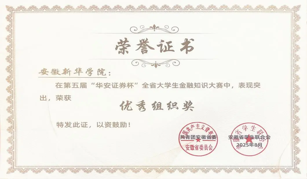 近日,由共青团安徽省委员会、安徽省学生联合会和华安证券股份有限公司联合主办的“华安证券杯”安徽省大学生金融知识大赛辩论赛专项活动圆满落幕。我校财会与金融学院学子代表学校参赛,凭借出色的组织工作和优异的赛场表现,荣获大赛“优秀组织奖”,参赛的五名同学全部获得“优秀个人奖”。