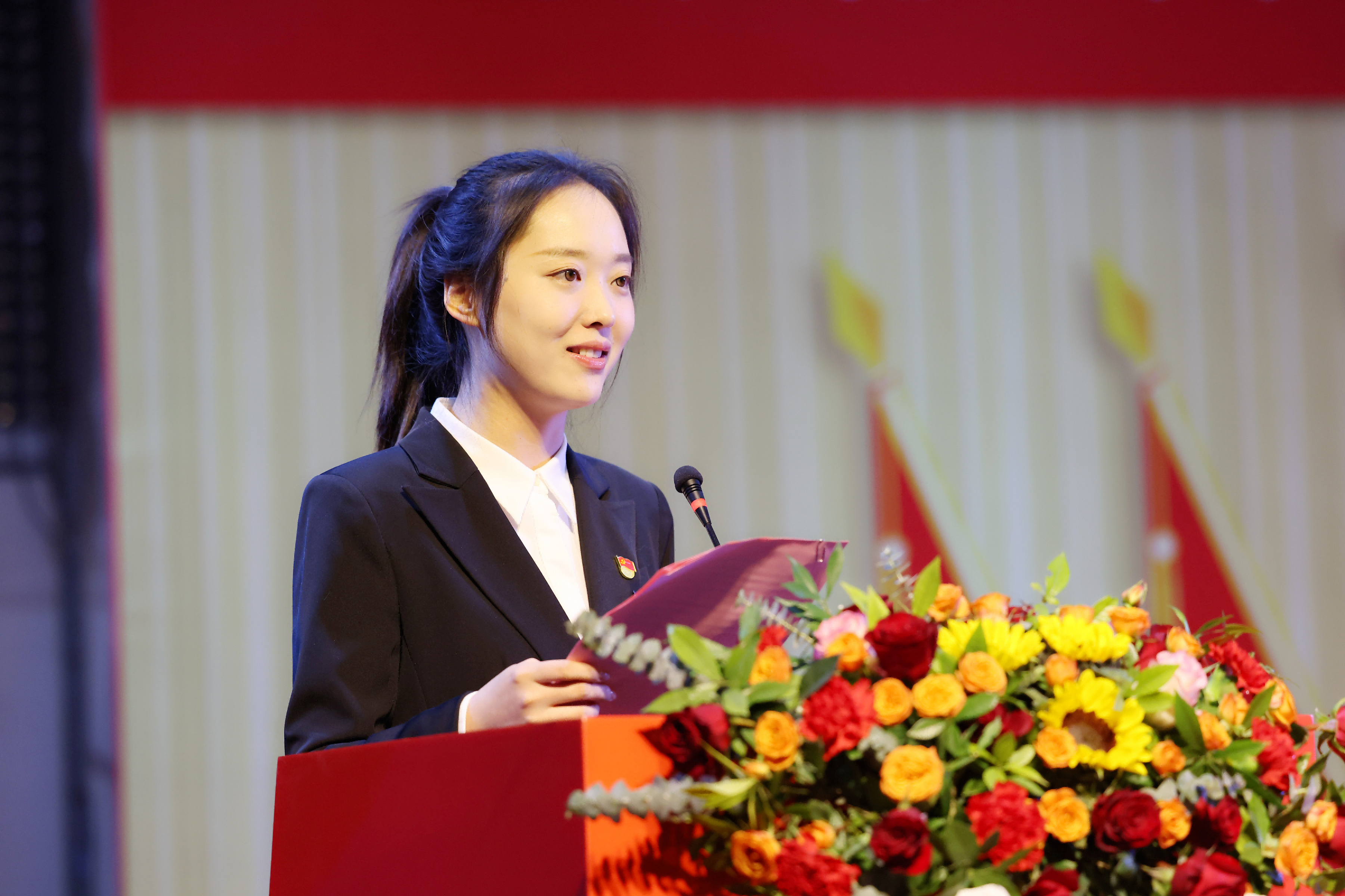 汤佳慧代表安徽省学生联合会致辞。她对大会的召开表示祝贺,并对安徽新华学院学生会在思想引领、组织建设、服务同学等方面取得的成效给予高度评价。她希望各级学生会组织持续深化改革,强化服务意识,团结带领广大同学坚定不移听党话、跟党走,在全面建设社会主义现代化国家的火热实践中贡献青春力量。