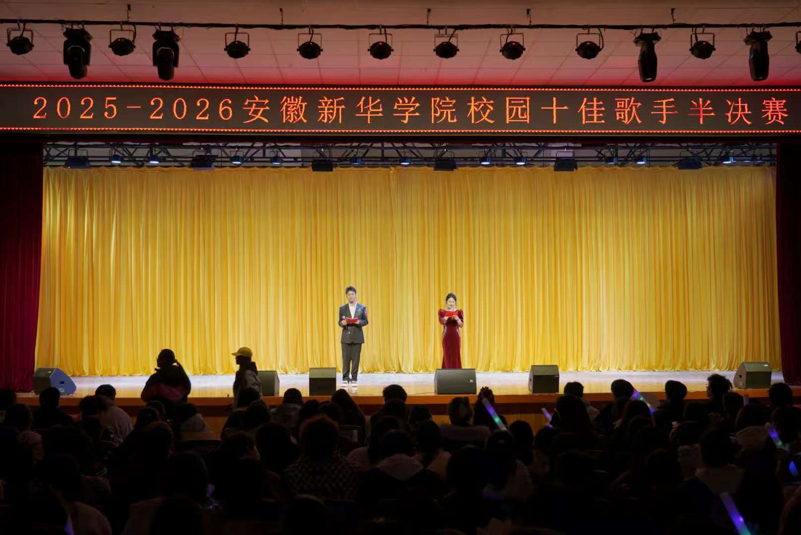 2025年12月12日晚18:30,由共青团安徽新华学院委员会主办、安徽新华学院学生社团发展中心承办的2025年校园十佳歌手半决赛在校大礼堂中温情收官。本届赛事以“声动新华,音你闪耀”为旋律,汇集校园热爱音乐的青春之声,用真挚演唱照亮冬夜,以动人乐章写意年华。文化与传媒学院李宏翔老师、音乐学院徐明明老师、音乐学院崇松荣老师、学生处/团委主管詹新宇老师、学生处/团委主管学生社团发展中心指导老师周刘湘老师出席并担任本次半决赛的评委。