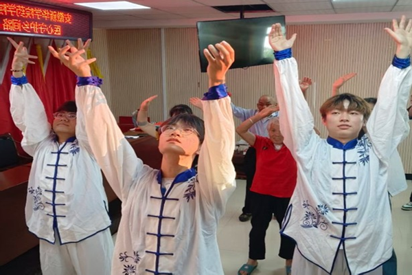 实践队一边示范,一边耐心纠正村民动作,详细讲解每个动作对疏通经络、调节气血的作用,村民们兴致勃勃地跟随练习。团队成员们还针对老年人常见的关节僵硬问题,特别设计了简化版动作,让不同年龄层的村民都能轻松参与。